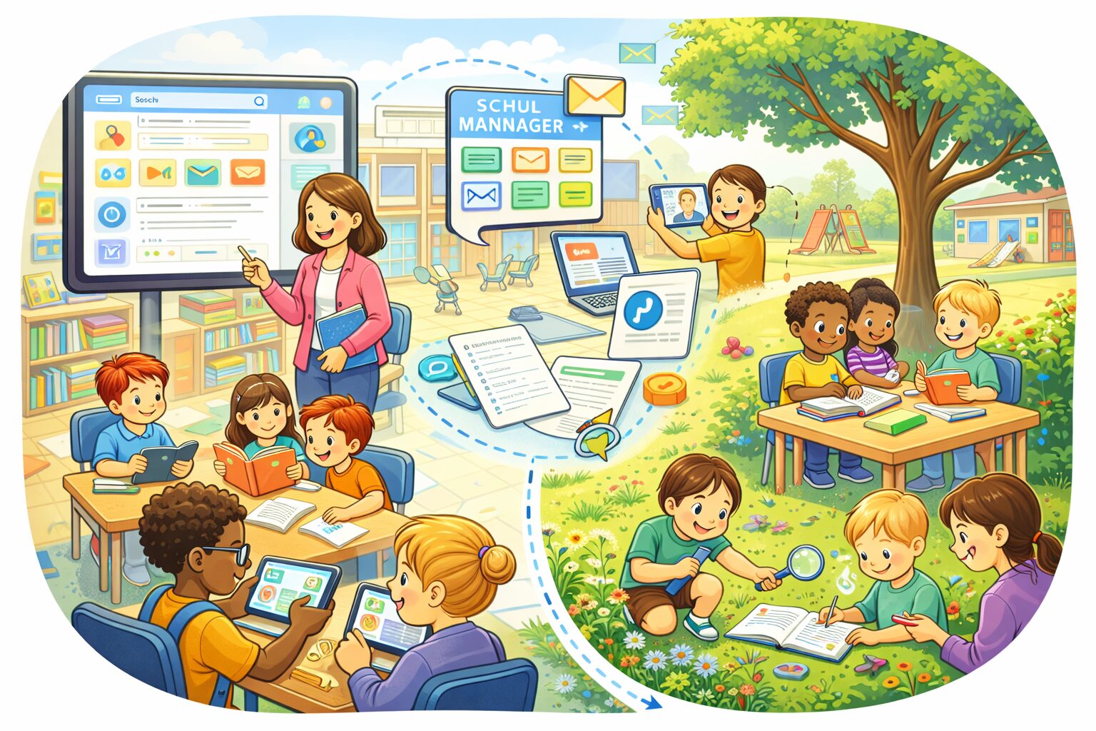 Auch organisatorisch nutzen wir digitale Strukturen. Über den Schulmanager können Eltern ihre Kinder krank melden, bekommen Elternbriefe und auch die Trogata ist integriert, so dass viele lose Fäden sinnvoll zusammenkommen.